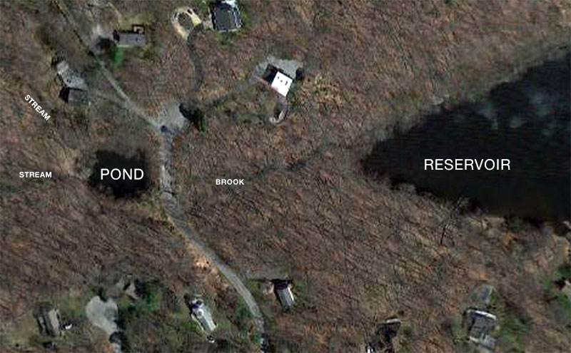 As best as I can calculate and measure it is about 200′ x 300′ and 20′ deep in the center. There are two streams on my property that feed it, albeit slowly and mainly underground, and it drains under Roads End Rd into a stream which continues to the reservoir:
